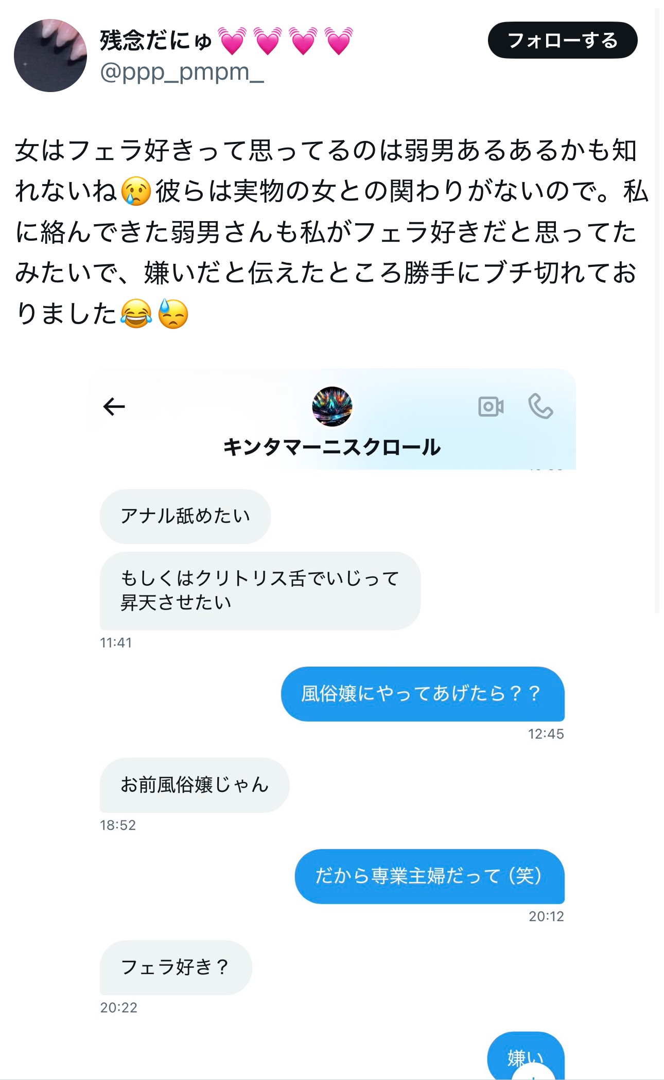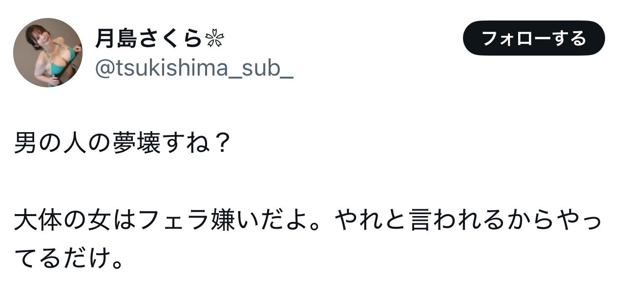 しかも、女の代表面して「えっ女はみんなフェラ嫌いダョ?」とか言うんだよな