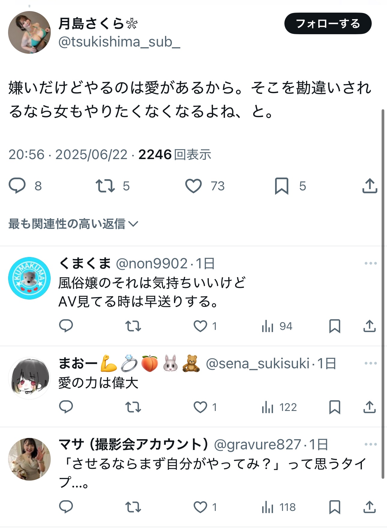 女性が気持ちよさそうに反応してくれるのが楽しい、女性もそうだと思うからフェラされてるときはオーバーに演技してる - 37 : 2025/06/24(火) 08:56:42.13 ID:kPEKcJCE0