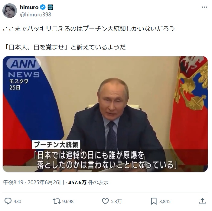 プーチン「日本では追悼の日にも誰が原爆を落としたか言わないことになっている」と直球発言