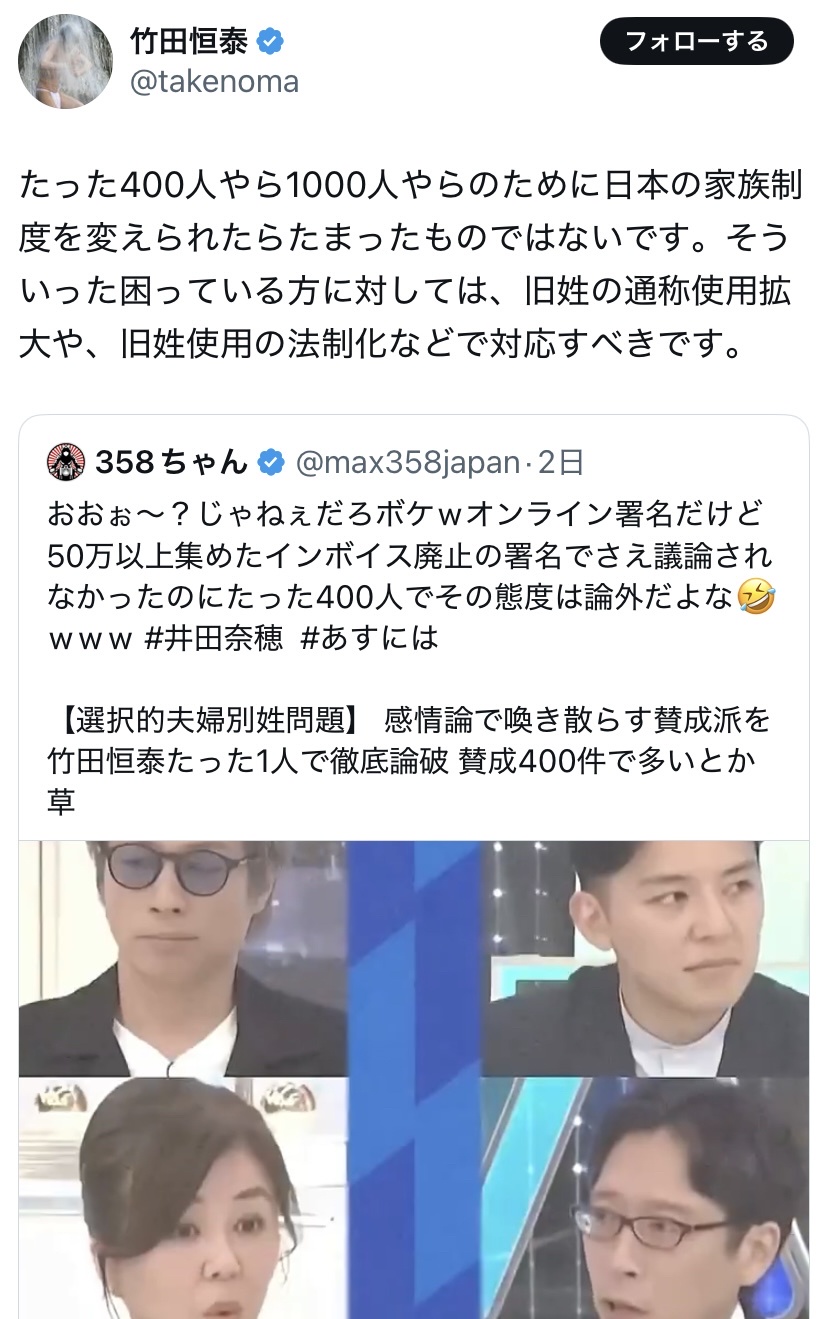 たった400人やら1000人やらのために日本の家族制度を変えられたらたまったものではないです。そういった困っている方に対しては、旧姓の通称使用拡大や、旧姓使用の法制化などで対応すべきです。