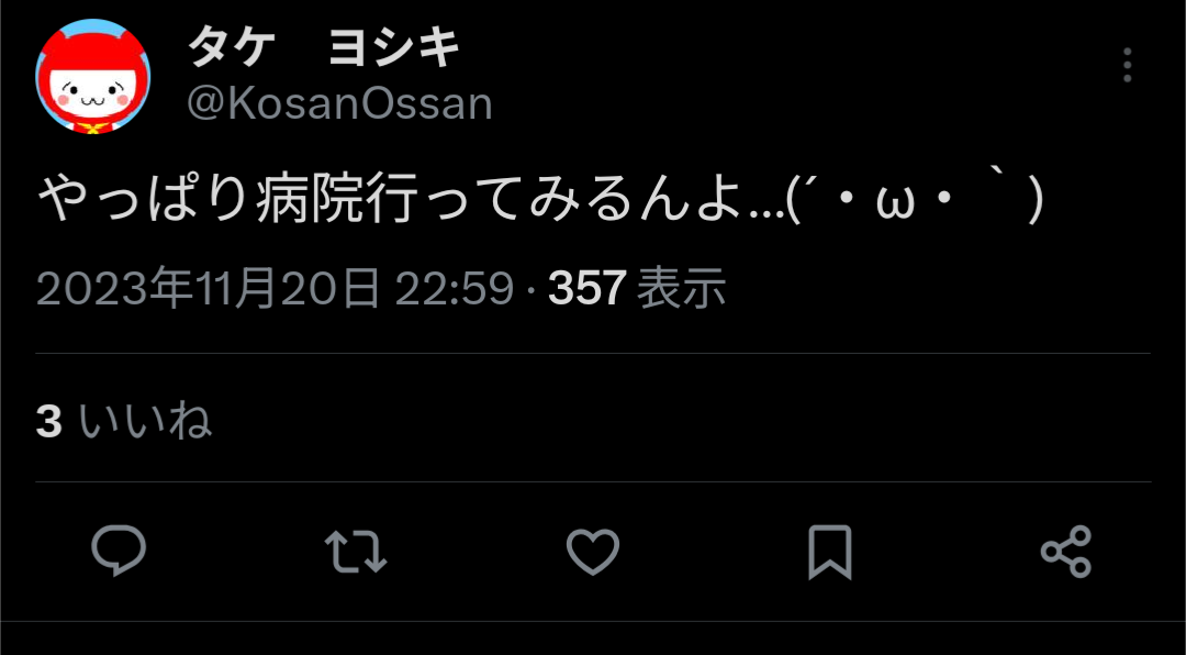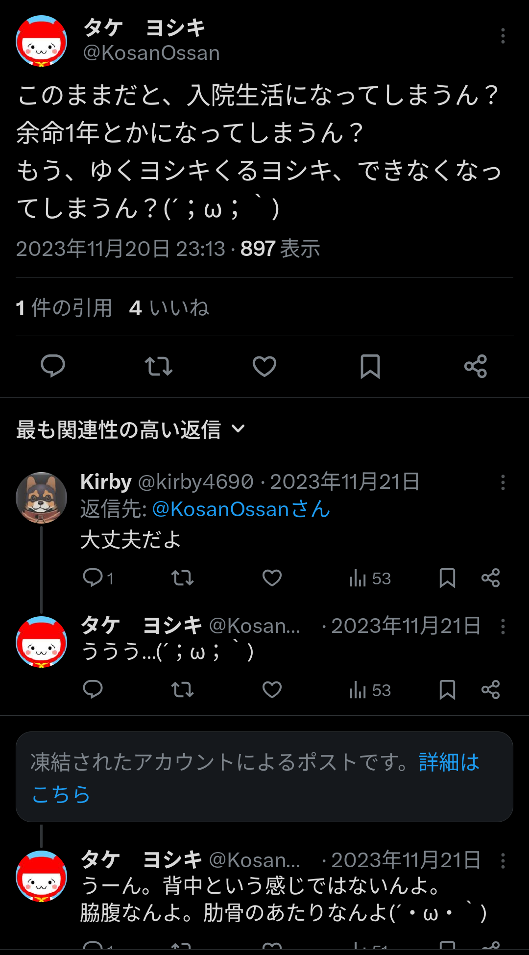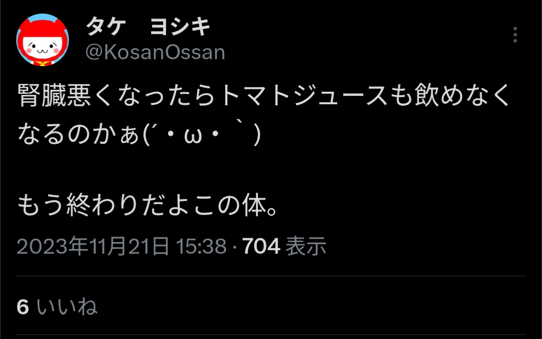 https://x.com/KosanOssan・2023年11月頃に体調不良を訴え受診、腎臓に異常が見つかる