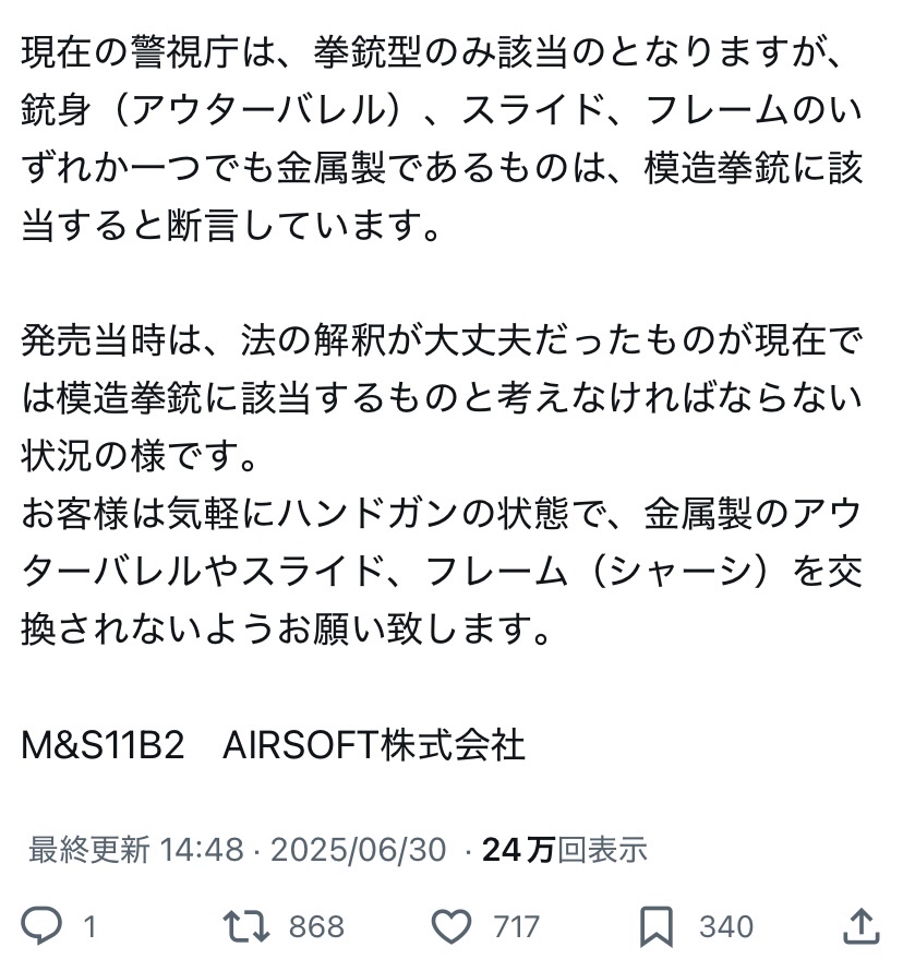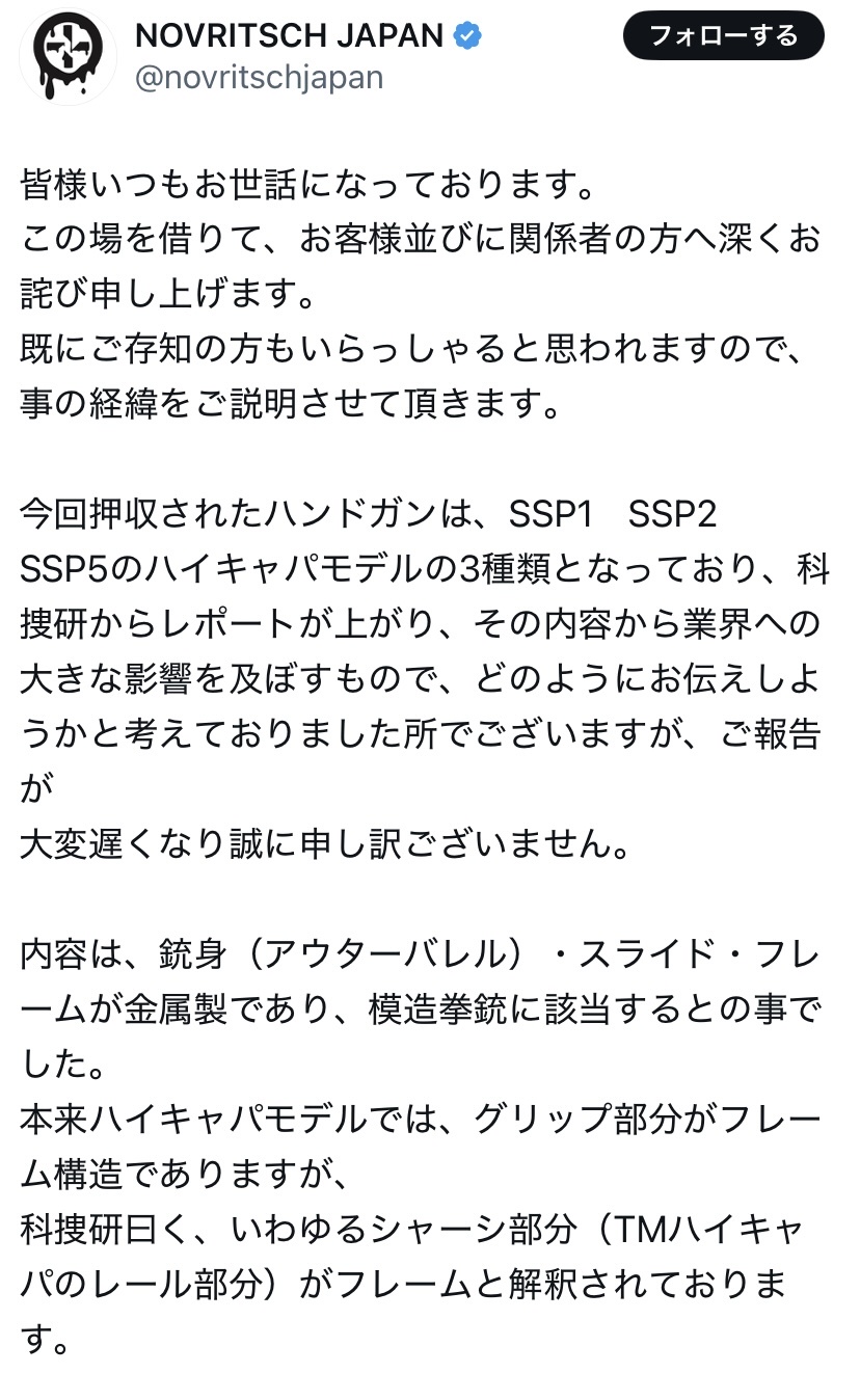 エアガンメーカーとか(特にフレームが金属のハイキャパ関連)は警察とか公安にゴマ擦ってなんとか通してもらってる状態らしいからな
