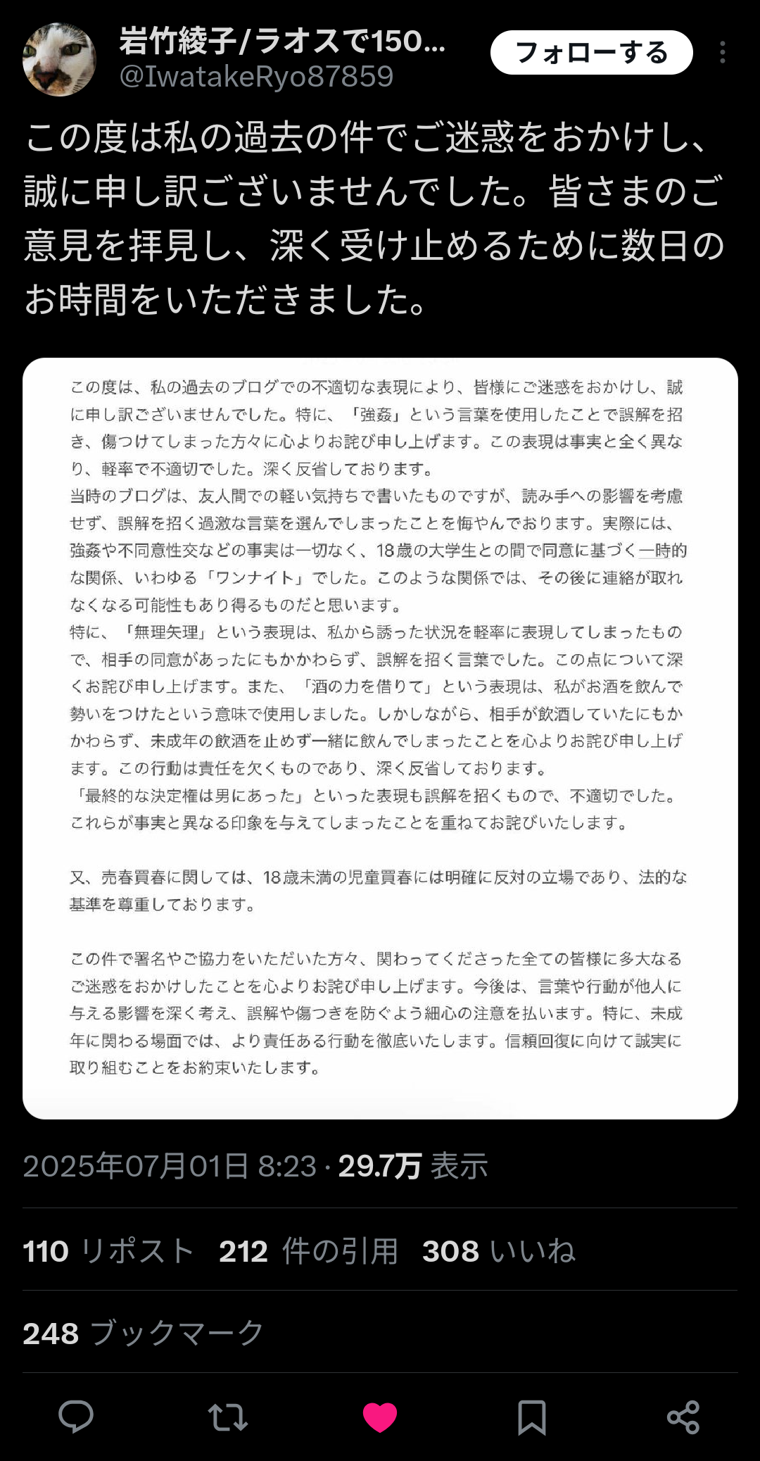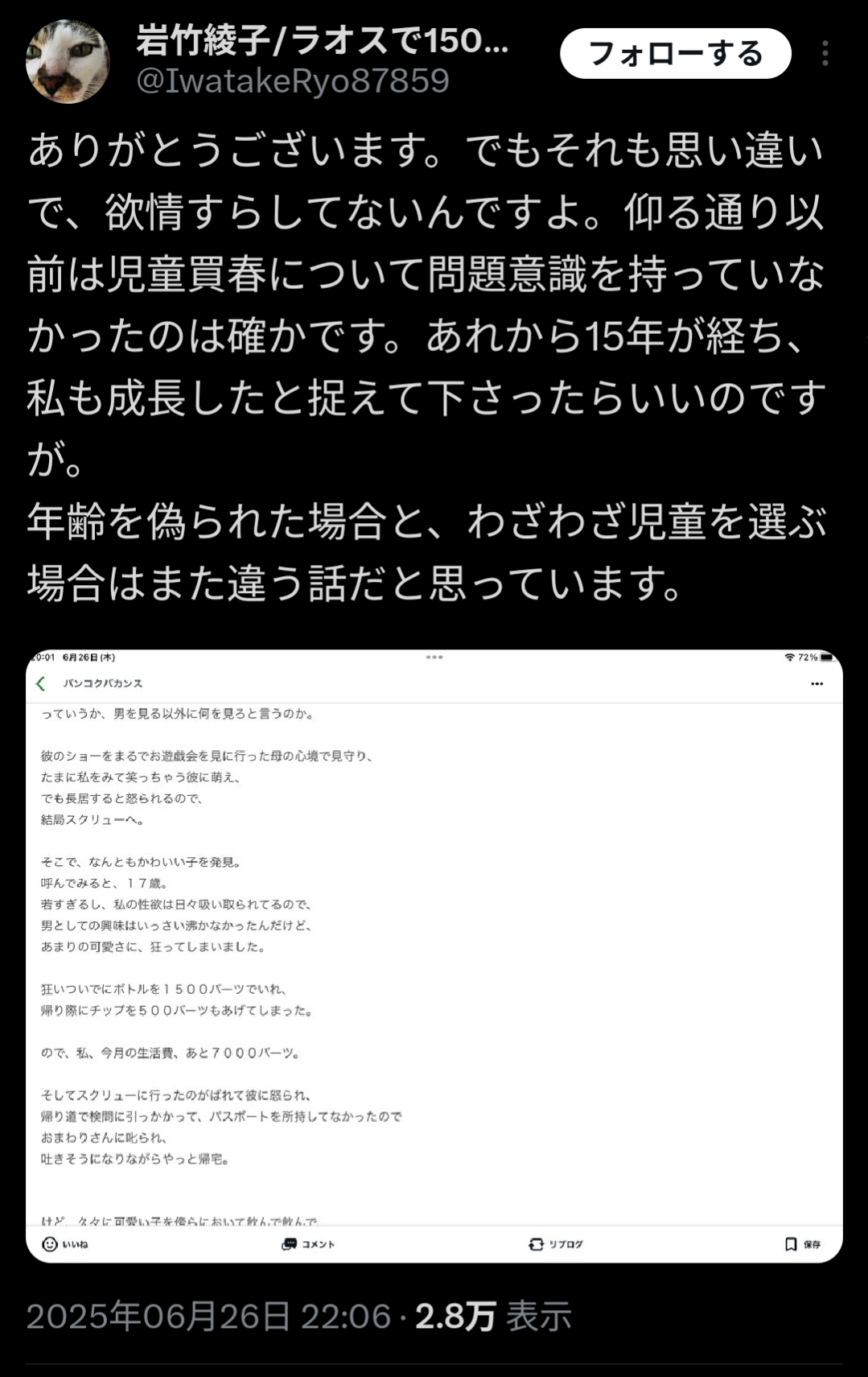 ちょっと海外で児童買春した疑いの女性、謝罪!「これからは世界中で買春してる日本人男性を許すつもりはありません」