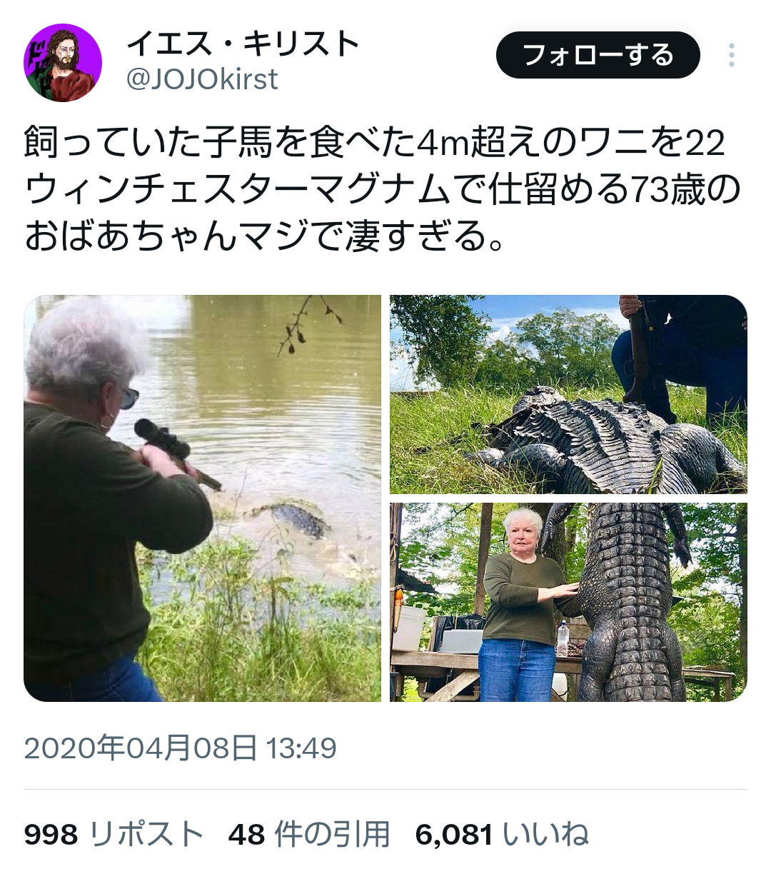【画像】愛馬をワニに喰われたテキサスのババア(73)、武装して報復に出るwwwwww