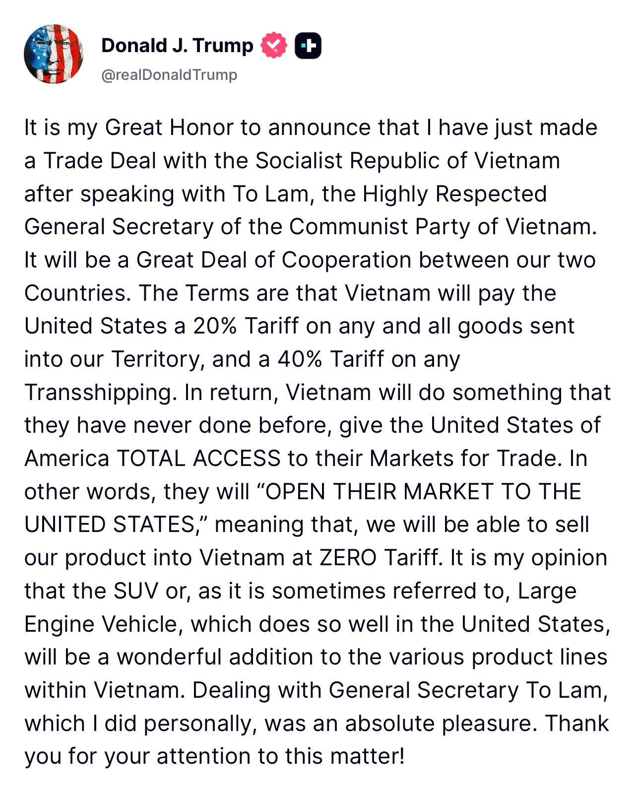 「相互関税を46%→20%に引き下げてやった代わりに関税ゼロでベトナム市場を解放しろ」