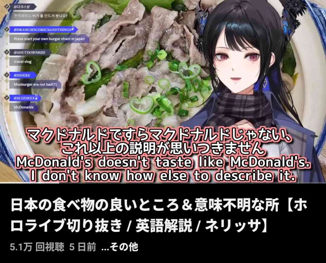 海外Vtuber「日本のスイーツはさほど甘くないのに普通に食事すると甘いのが多いんですよね。何にでも砂糖入れるから。卵焼きとか。日本のマックも味が全然違う」