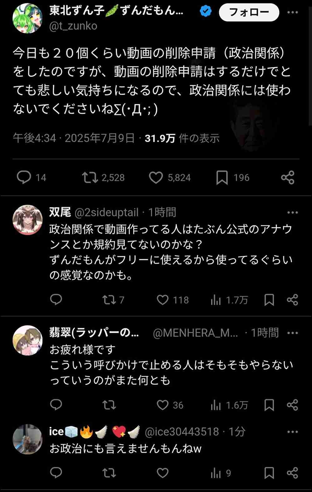 ずんだもんはヘイト動画取り締まらないから政治系だけ20個消したところでイメージ全然変わらねえんだがw