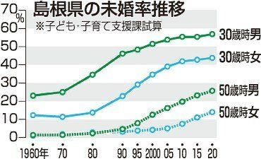 島根50歳男性の未婚率25% 30年で21ポイント増、氷河期世代で高く 2020年時点