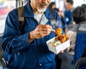高速バスや遠足の貸切バスならともかく、路線バスでの飲食は原則禁止なはずですが、この男性はお構いなしでもくもくと弁当を食べ続けていたそうです。