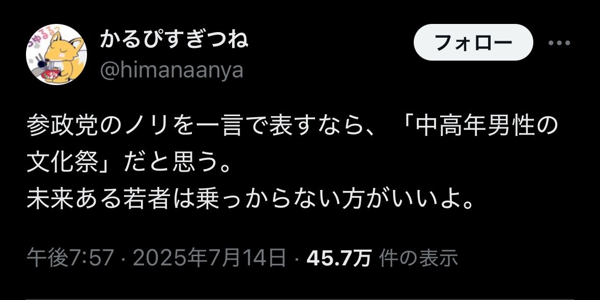 この前駅前通ったら参政党支持者の氷河期みたいなおっさんらが日の丸掲げながら選挙に行こう!って練り歩いていたな