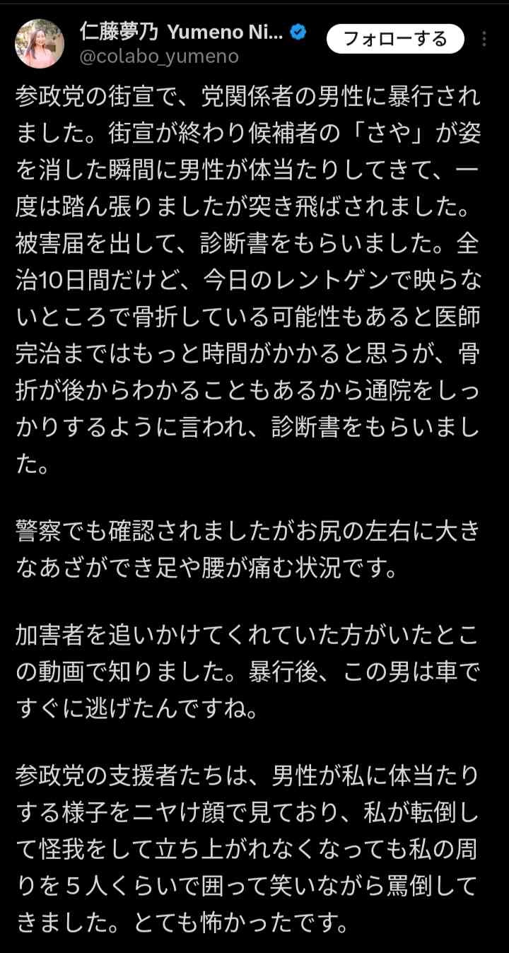 こういう積極的な暴行を働くカスが参政党の影響でどんどん増えるぞ