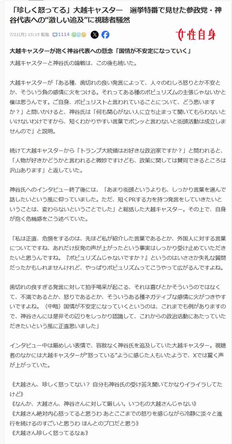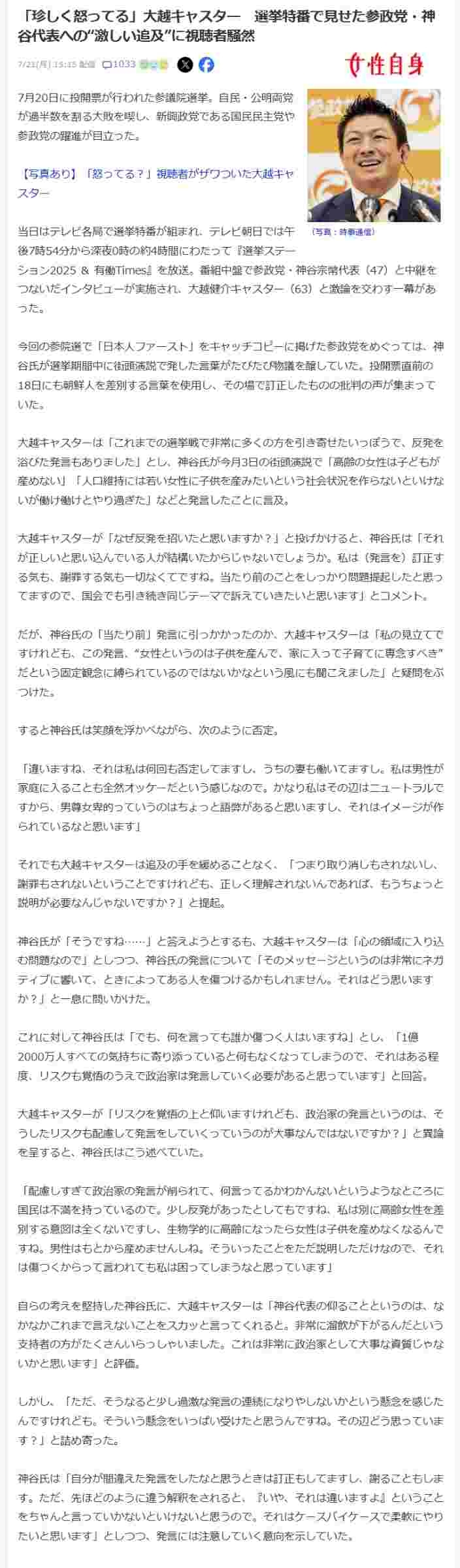 僕も昨夜のインタビューはちょっとひどくないかと思ったが、今後大きくなる政党としてはあれくらいの厳しいやりとりは仕方ないかなとも思った。この女性に関する発言についてはマスコミがわざと曲解してる感があるね。神谷代表の発言の趣旨は女性も働けという一方の選択肢ばかり強調されていた世の中を女性が好きなほうを自由に選べるようにしたいということだと思うのだが、それがマスコミの耳に入ると脳内で昭和の男尊女卑の光景に変換されるのだなぁと。この部分のやりとりはかなりマスコミのほうに問題があると思うよ。だからこそ参政党が大躍進したのだろうなと思うね。
