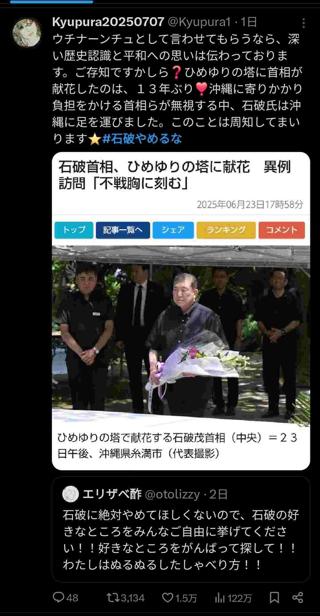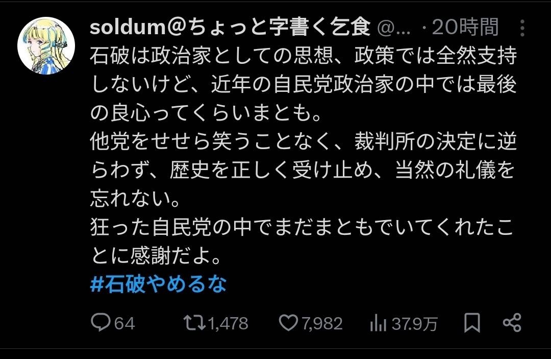 石破って自民党議員の中じゃリベラルがイラつくような発言あんましないし、首相でいる間は自民党の勢力弱めてくれるしでそら少しでも長く続けて欲しいだろうな