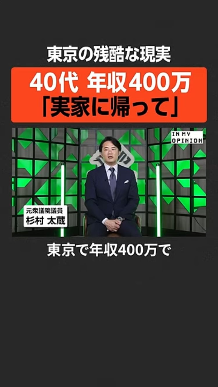 これに杉村氏は、「東京で一人暮らしで賃貸マンション」の人はお金が貯まりにくいとし、「気分を悪くしないでほしいんですけど」と前置きしつつ、「上京してきて40(歳)になって年収が400万(円)に満たない方は、ぜひ地方の移住(を)」と提案した。 Just a moment...greta.5ch.net