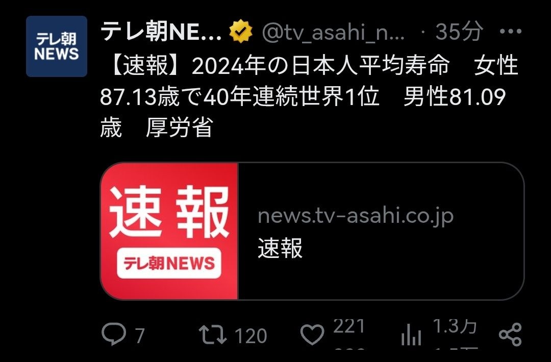 それ「ある年に亡くなった人の平均年齢」を単純に求めてるだけで平均寿命とは全然違うんだけどな