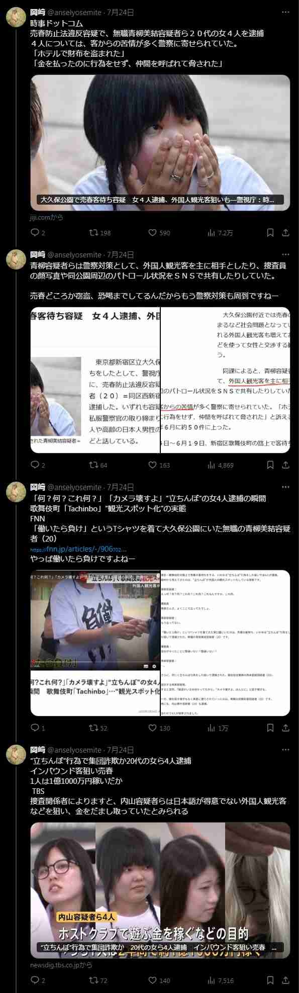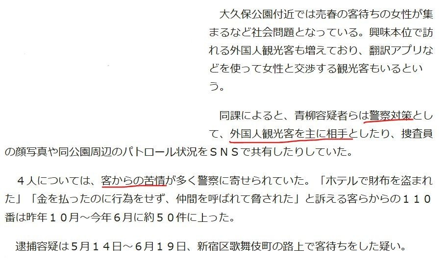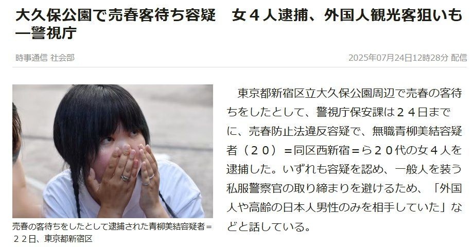 大久保公園出立ちんぼしてる女は軒並み私服警官に捕まってるけど、ホストやスカウト、反社とのつながりを聞かれて、それと関係無ければ即解放される