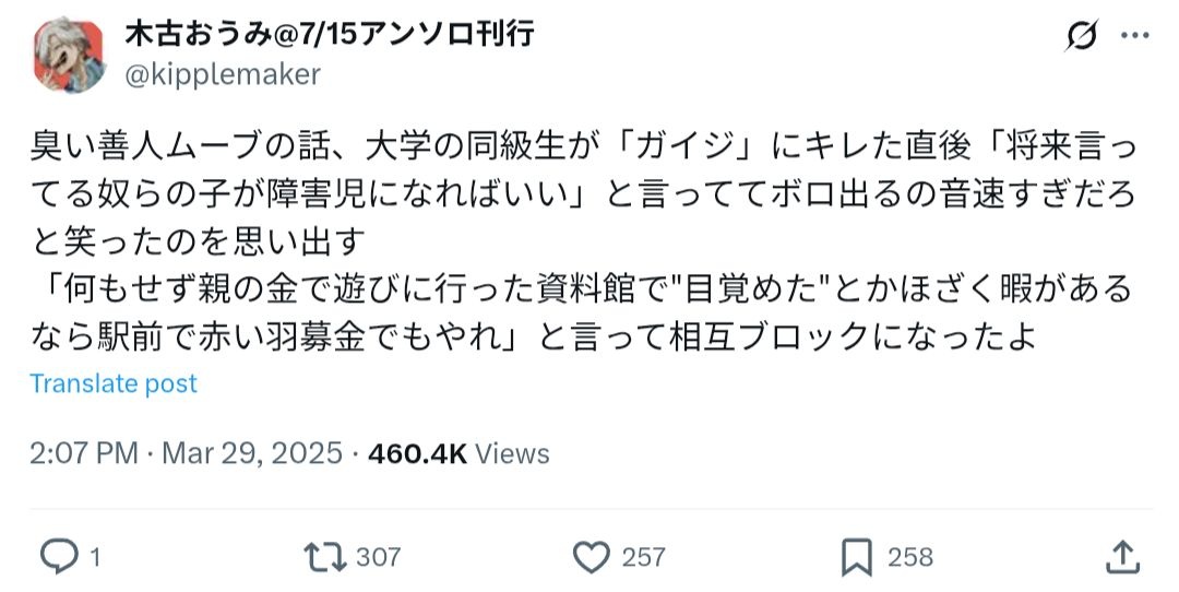 木古「『臭い善人ムーブ』というと、大学の同級生が『ゲェジ』という言葉にキレて『言ってる奴らの子が障害児になればいい』と言ってて笑ったのを思い出す」