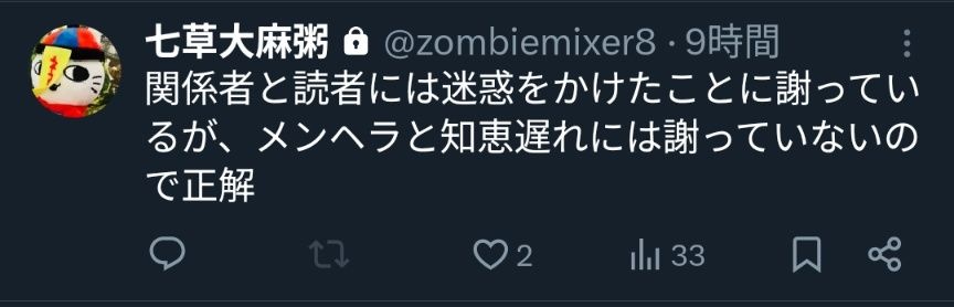 木古のサブ垢「メンヘラと知恵遅れには謝っていないので正解」