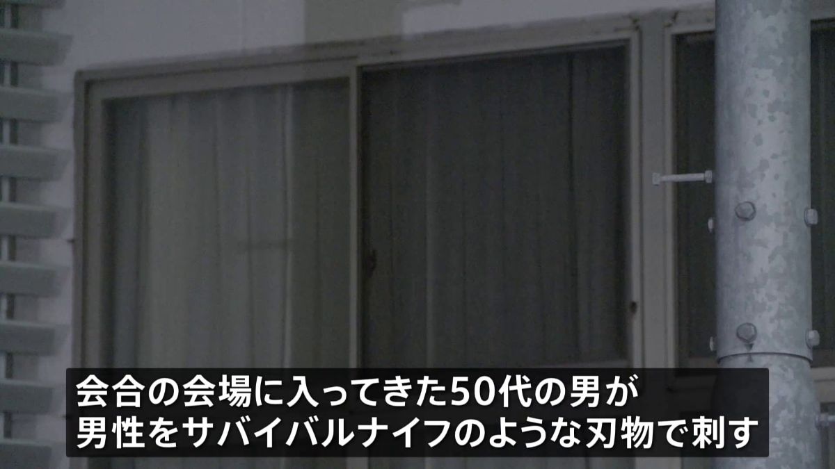 警察によりますと、公民館では会合が開かれていて、会場に入ってきた50代の男が参加者の男性をサバイバルナイフのような刃物で刺したということです。