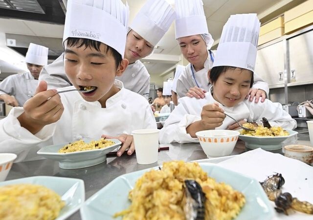 浜松市中央区の浜松調理菓子専門学校は3日、昆虫食の体験イベントを同校で開いた。市内の小中学生ら17人が、セミをチャーハンに調理して味わった。 参加者は浜松城公園でアブラゼミとクマゼミ約30匹を捕獲。教員や学生の指導の下、セミを素揚げにして包丁で刻んだ。チャーハンに混ぜ込んで完成させると、恐る恐る口に運んだ。セミをチリソースで味付けした「セミチリ」や蜂の子のつくだ煮も試食した。