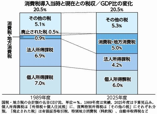 政府は“消費税は社会保障を支える財源”だなどと主張しています。消費税を導入した1989年度と2025年度の税収を国内総生産(GDP)比でみると、