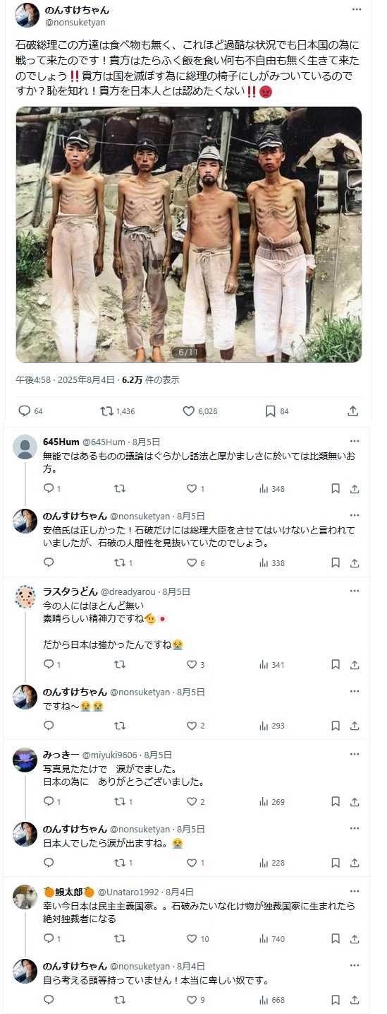 愛国者「日本兵は飢餓と病気でもお国のために戦った。石破は国を滅ぼす為に総理を続けてる。恥を知れ😤!」