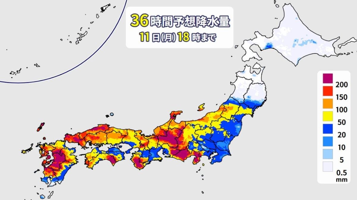 11日の朝にかけても福岡県、佐賀県、長崎県、それに山口県では線状降水帯が発生するおそれがあり、警戒を続けてください。
