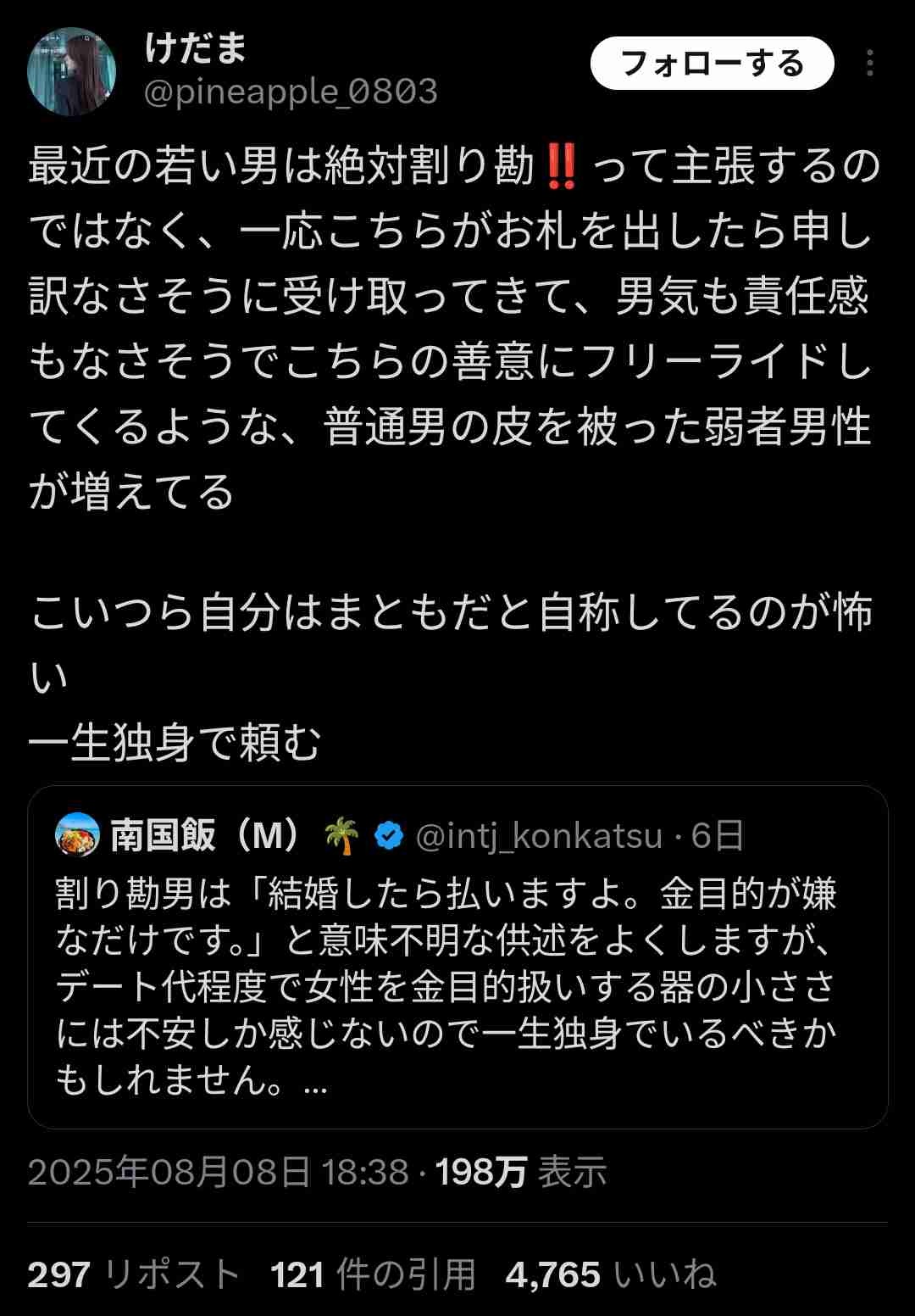 男は女子供と同じステージに生きてないんだから飯代くらい出してあげて当然だと思う