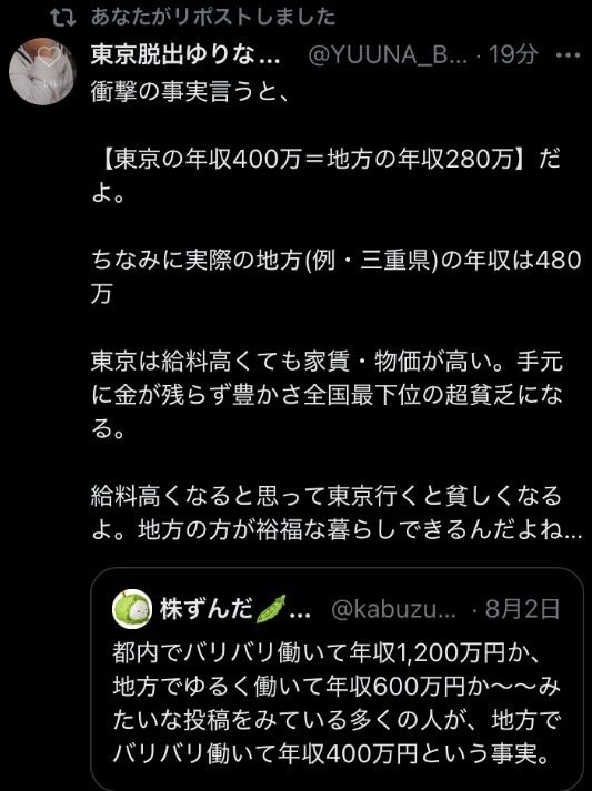 給料高くなると思って東京行くと貧しくなるよ。地方の方が裕福な暮らしできるんだよね…