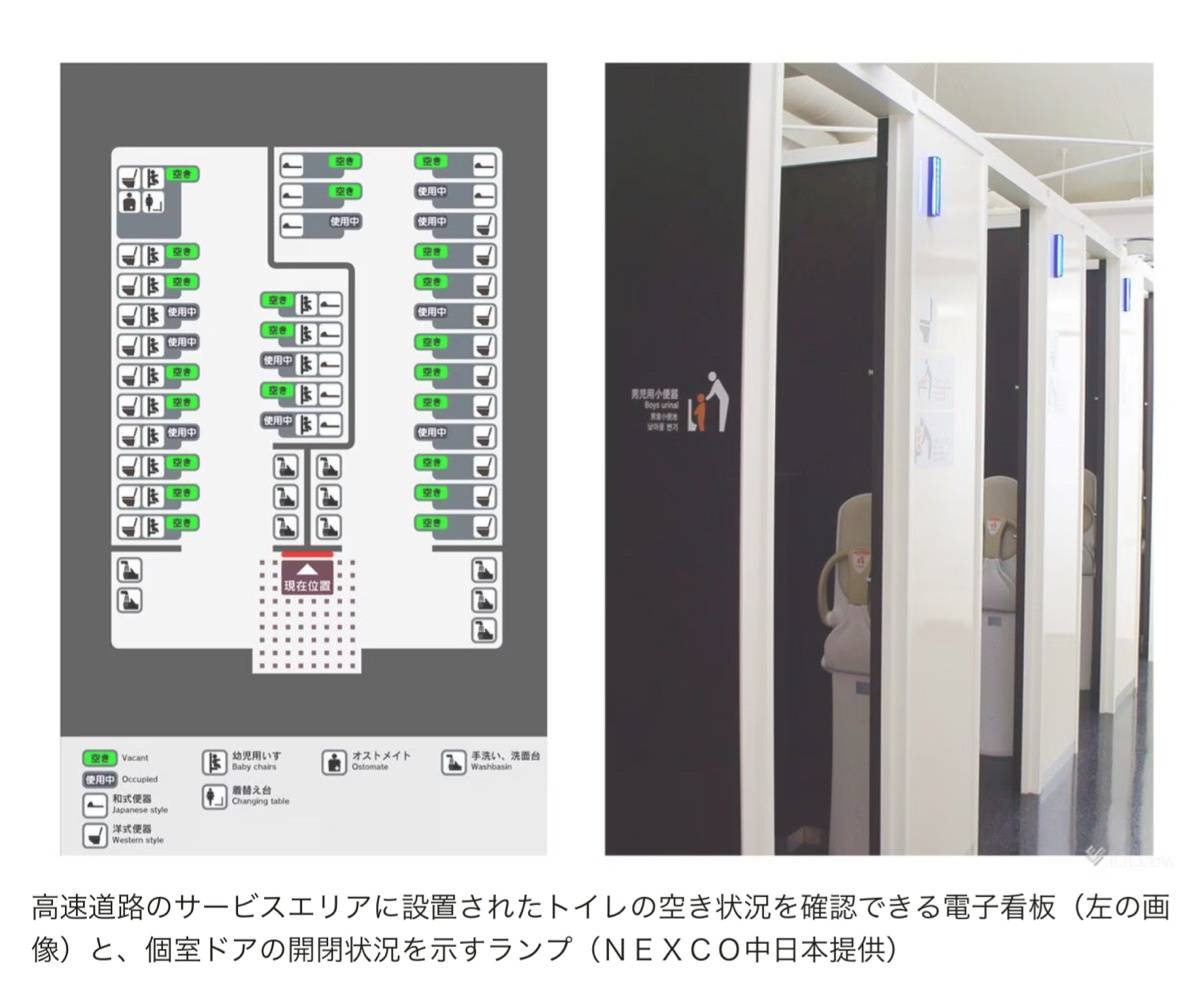 高速道路のサービスエリアに設置されたトイレの空き状況を確認できる電子看板(左の画像)と、個室ドアの開閉状況を示すランプ