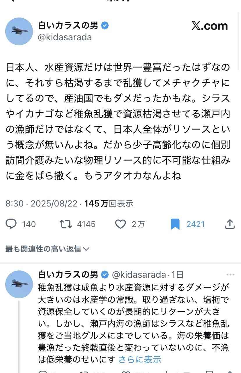 最近はジャップに漁獲量制限かけてるから水産資源が回復してるんだよ