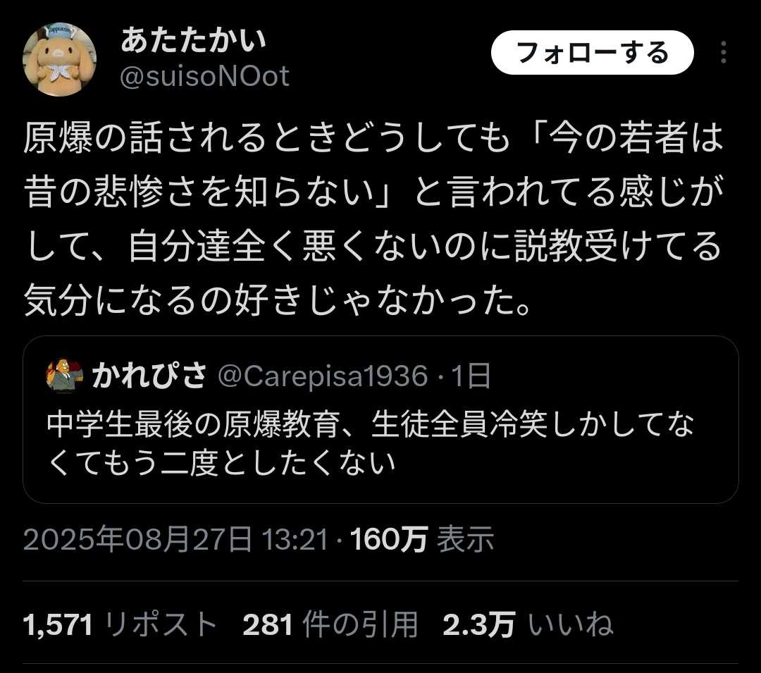 日本の若いのが「いつまでも原爆でぐちぐち言ってんのはアメリカが気の毒じゃん」