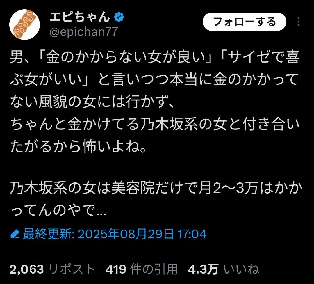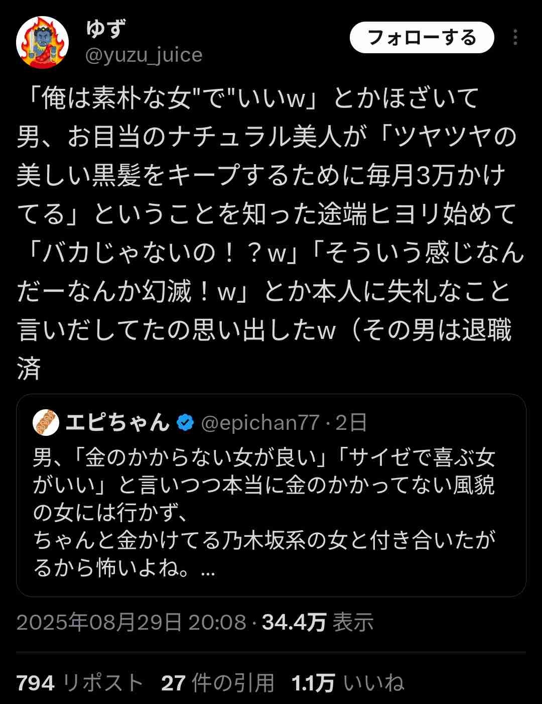 女「素朴な女が良い?ナチュラル美女は毎月3万美容にかけてるぞカス!ガチの素朴はヒゲワキ股間ボーボーのほぼ男や」
