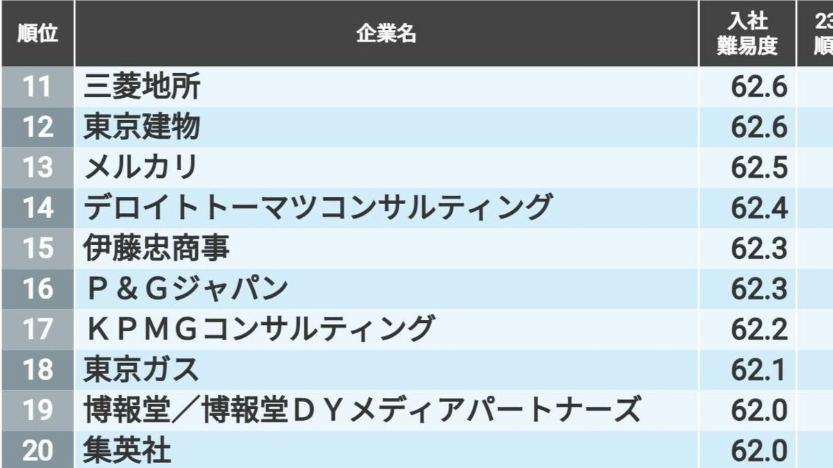 次に、この大学の入試難易度を基に、各企業の入社難易度を算出した。例えば、東京大から1人、一橋大から4人、早稲田大から5人を採用した企業があった場合、その企業の入社難易度は、(東京大68.8×1人+一橋大64.9×4人+早稲田大64.6×5人)÷合計採用者数10人=65.1になる。この入社難易度を就職判明者10人以上の企業に絞ってランキングしたのが「入社が難しい有名企業ランキング」となる。同率で順位が異なるのは、少数点第2位以下の差による。