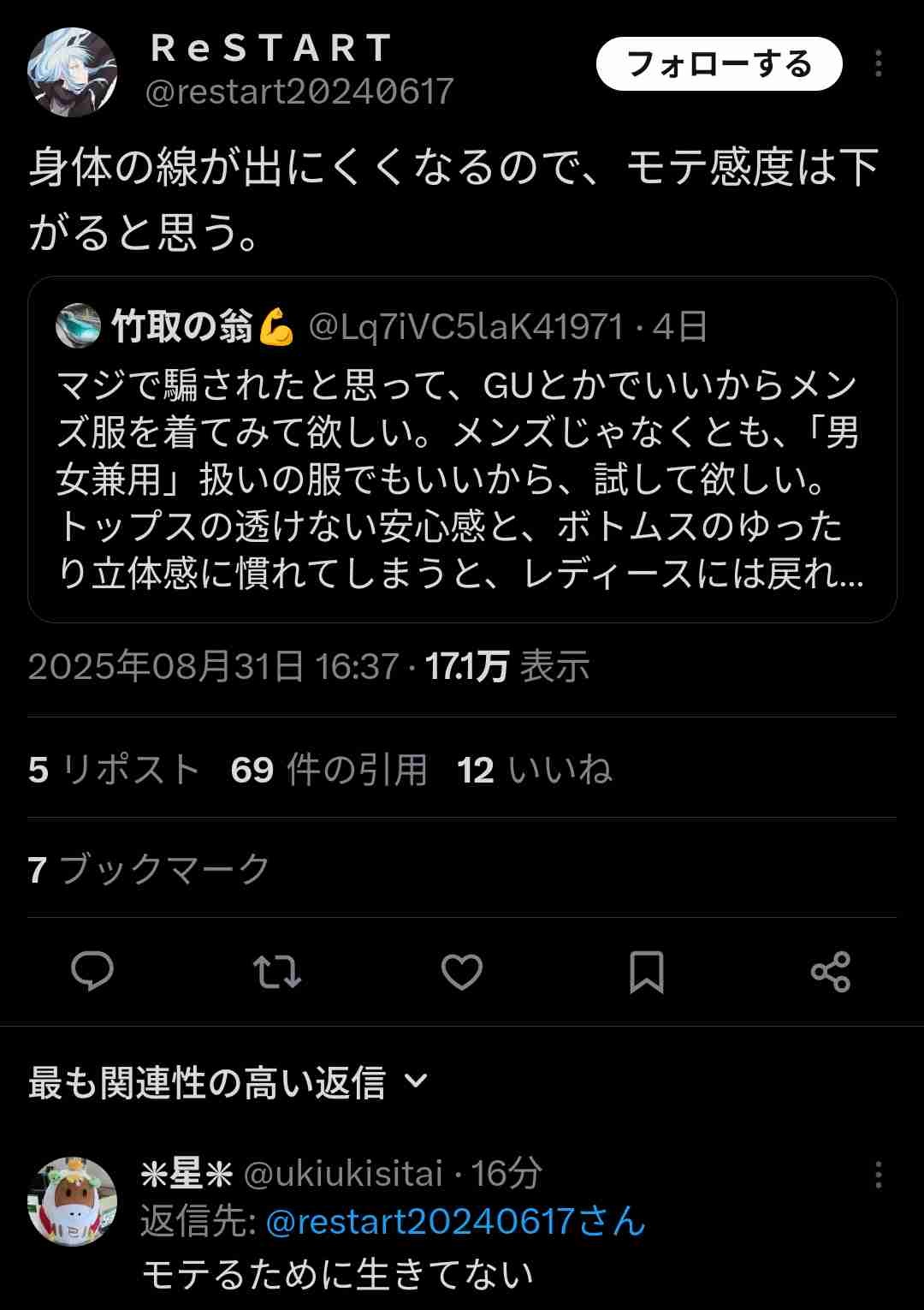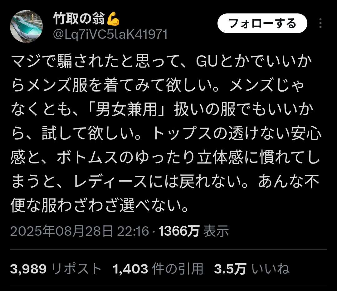 女「モテなくて良い。身体のライン出なくてダルダルの男服を女はあえて求めてる。動きやすいし最高」