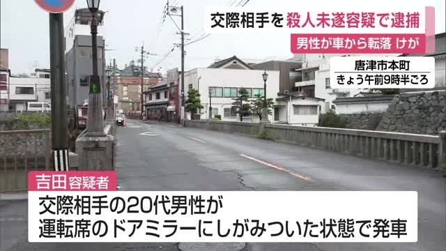 吉田容疑者は1日午前3時ごろ、唐津市本町の駐車場で交際相手の20代男性が運転席のドアミラーにしがみついているのを知りながら発車。