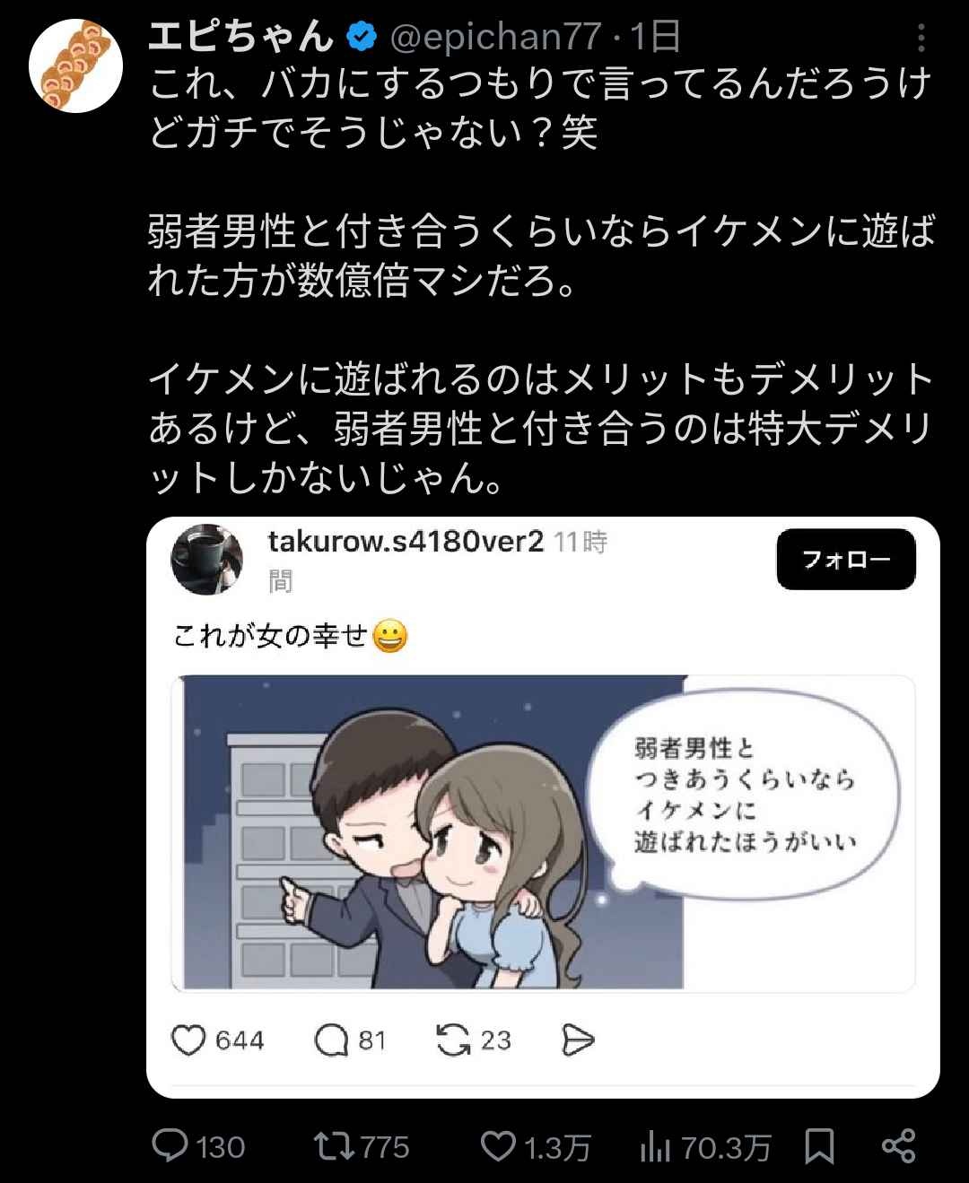 イケメンから需要ないから今度は弱男に粘着してレスバしてるだけでしょ