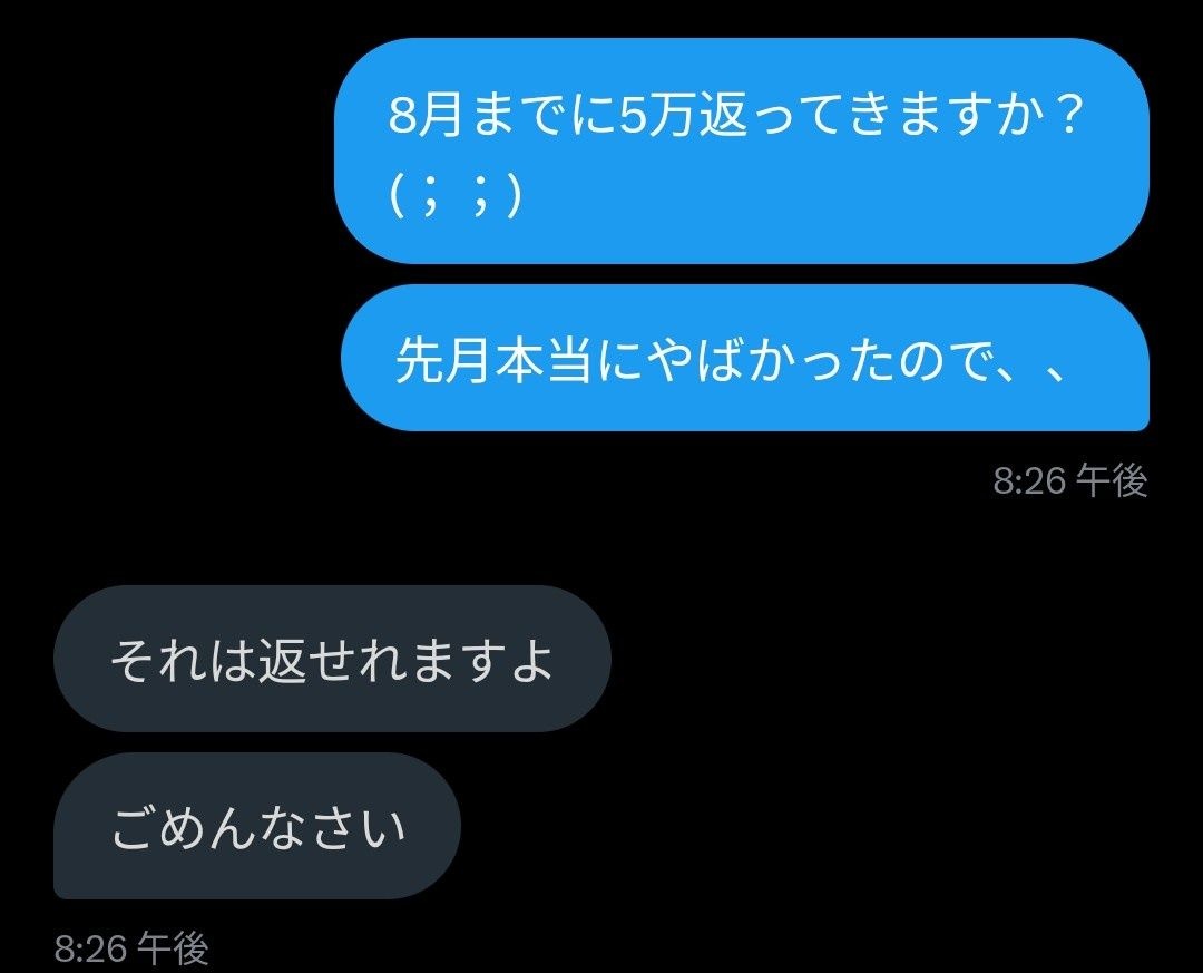 パパ活相手にお金貸してたら普通に帰ってこないのもありますし、パパ活してる子達は大変なことや、色んなことがあるからしてる訳で、生活大変なのもありお金借りてる子もいるので、私は帰ってこないのは結構普通だと思います
