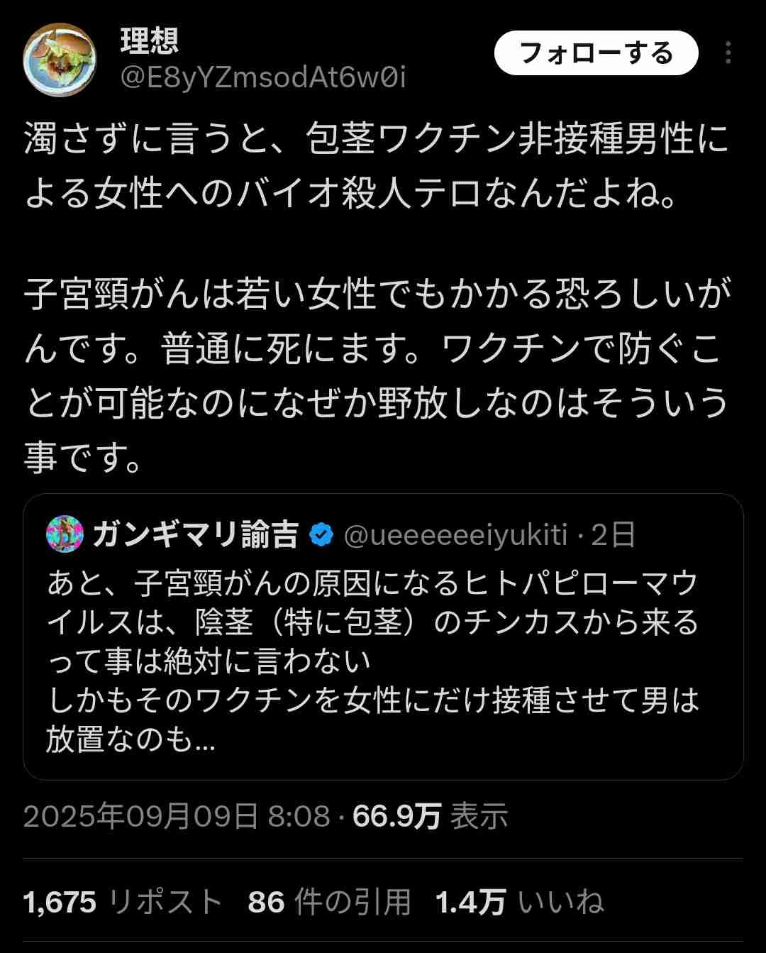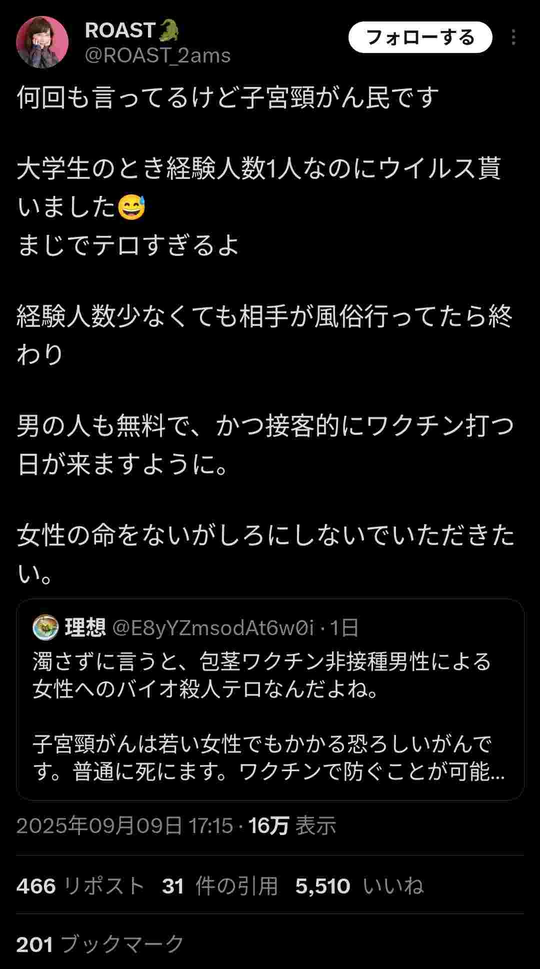 ウイルス由来の病気だし、処女なら子宮頸がんにはならないんだから男がワクチン打つべき病気だと思うんだけど