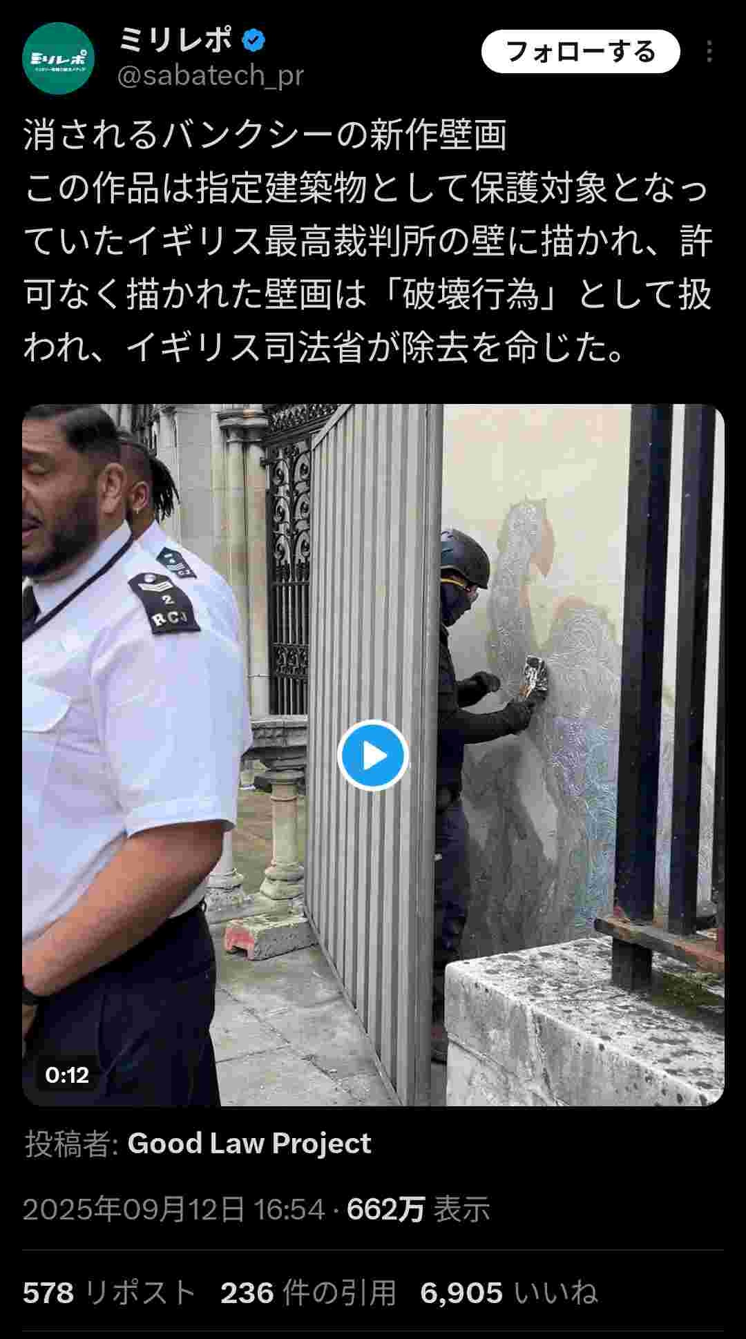 いや、バンクシーの絵ってそんな簡単に消せるもんなのかね。ジャップ政府との比較もなんか無理やり感あるけど。 『ジャップ』に反応し、作動を成立。 BE[802034645]はこれまでに68スレ/2814レス分、スクリプト加速を取得している。