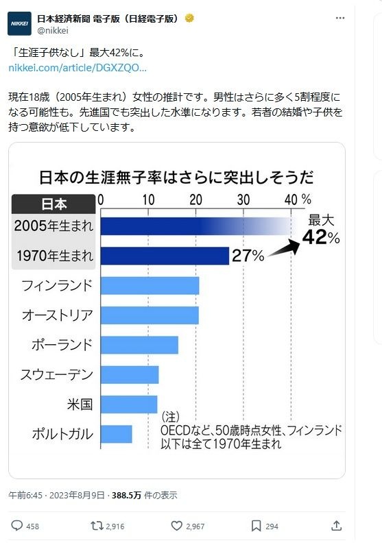 ところで、すでに生涯一人の子も持たない「生涯無子率」は、