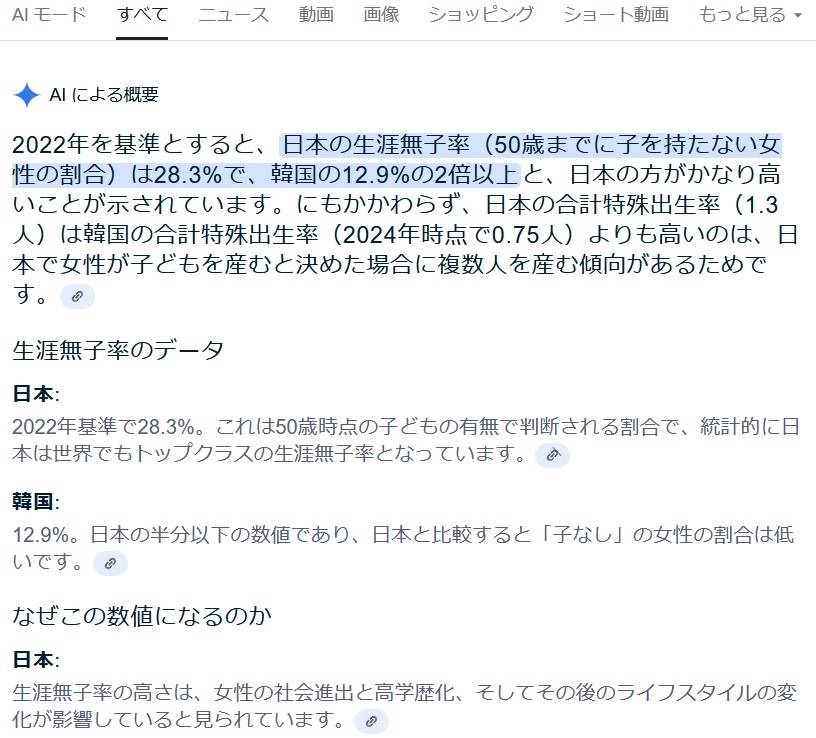 生涯子なしの割合、日本は韓国の2倍以上高い