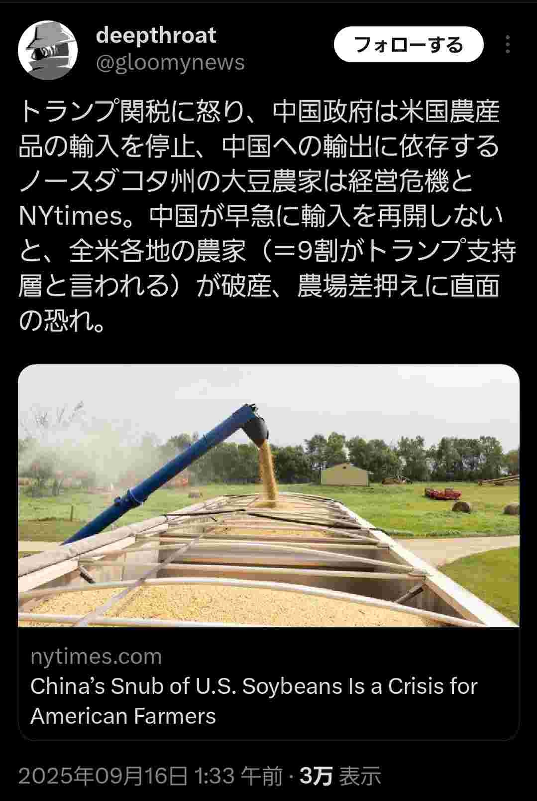 ていうかそもそもアメリカの農家なのに中国に売るってのは売国行為やん