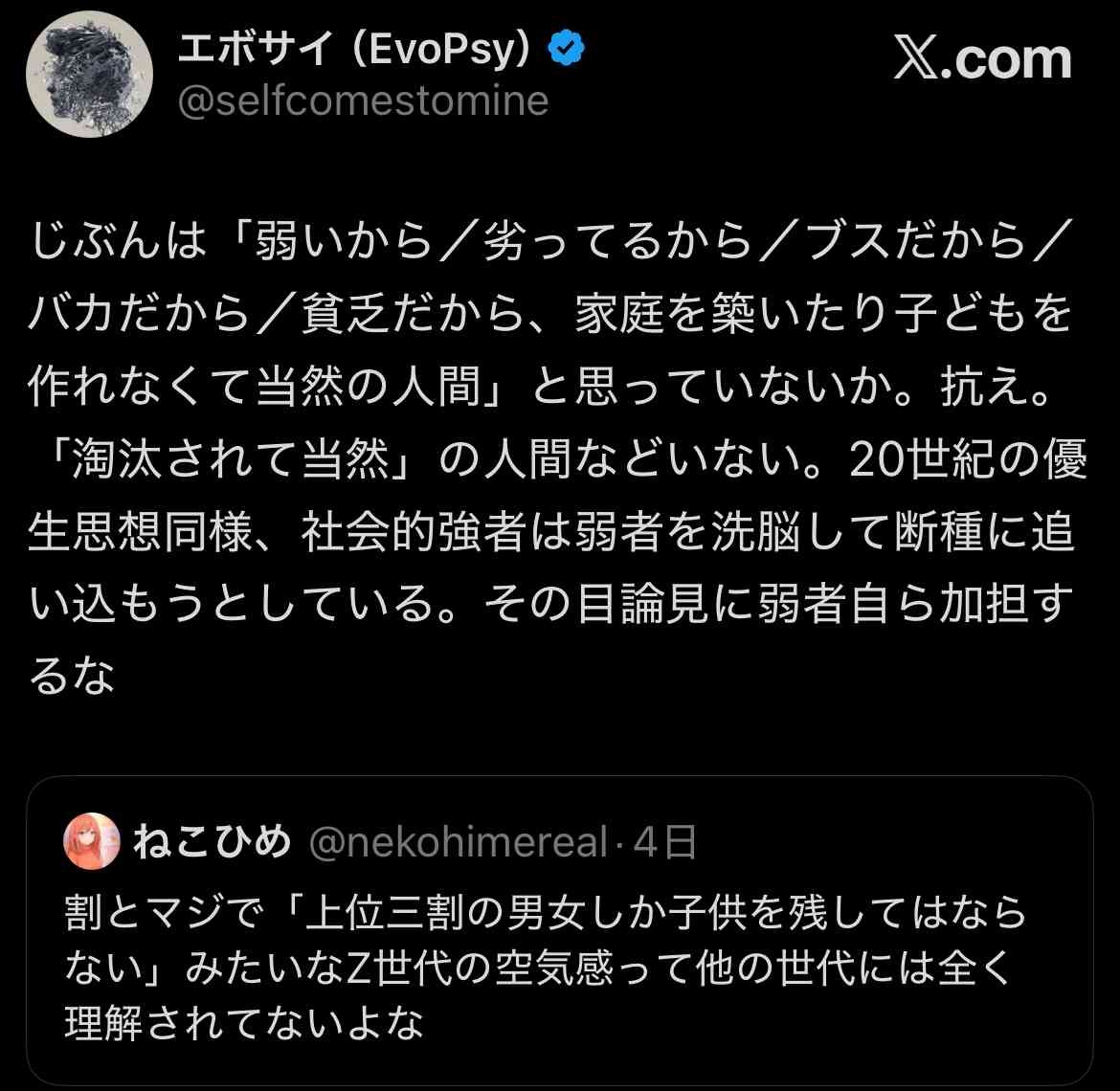 弱者男性が無理して子供作ったところで弱者の遺伝子継承するだけなんだから