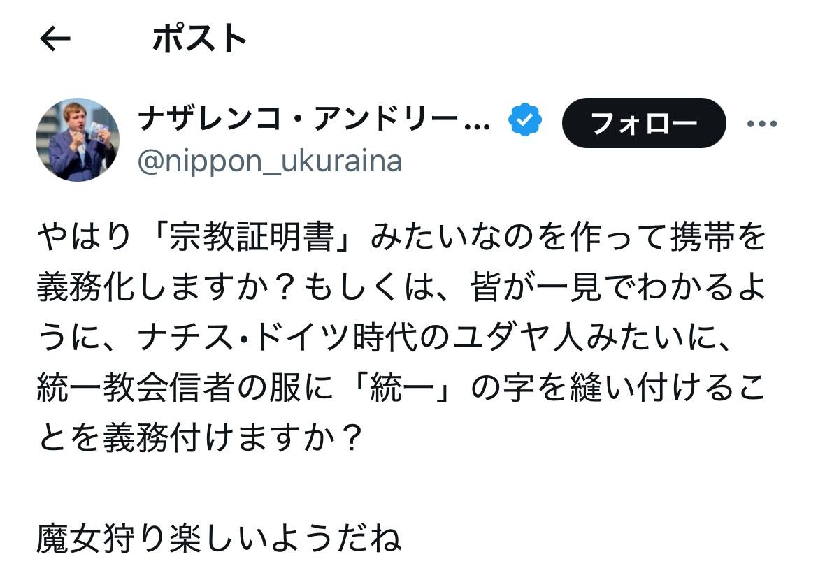 意味わかんねえな。統一は宗教法人格取り消しの訴えが地裁で通る程度には反社。良く魔女狩りとか言えるわ