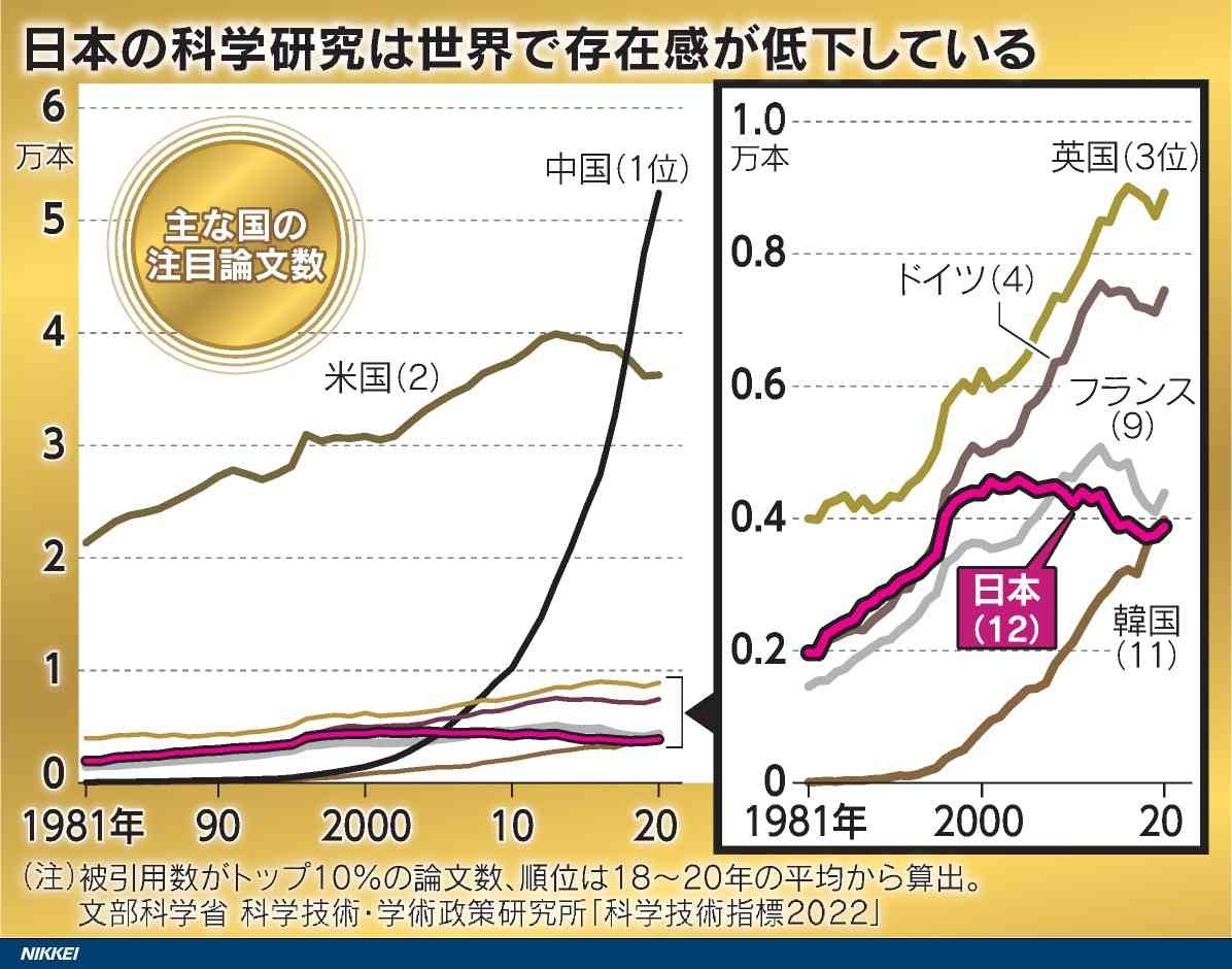 注目の科学論文数、日本は過去最低の13位 1位中国、2位米国