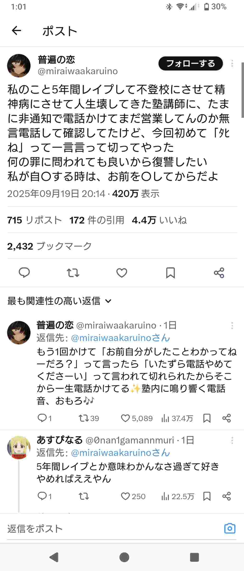 これ仮に塾の電話にやってるってことは加害者側の先生かわからんやつに4ねって言った可能性があるってこと?