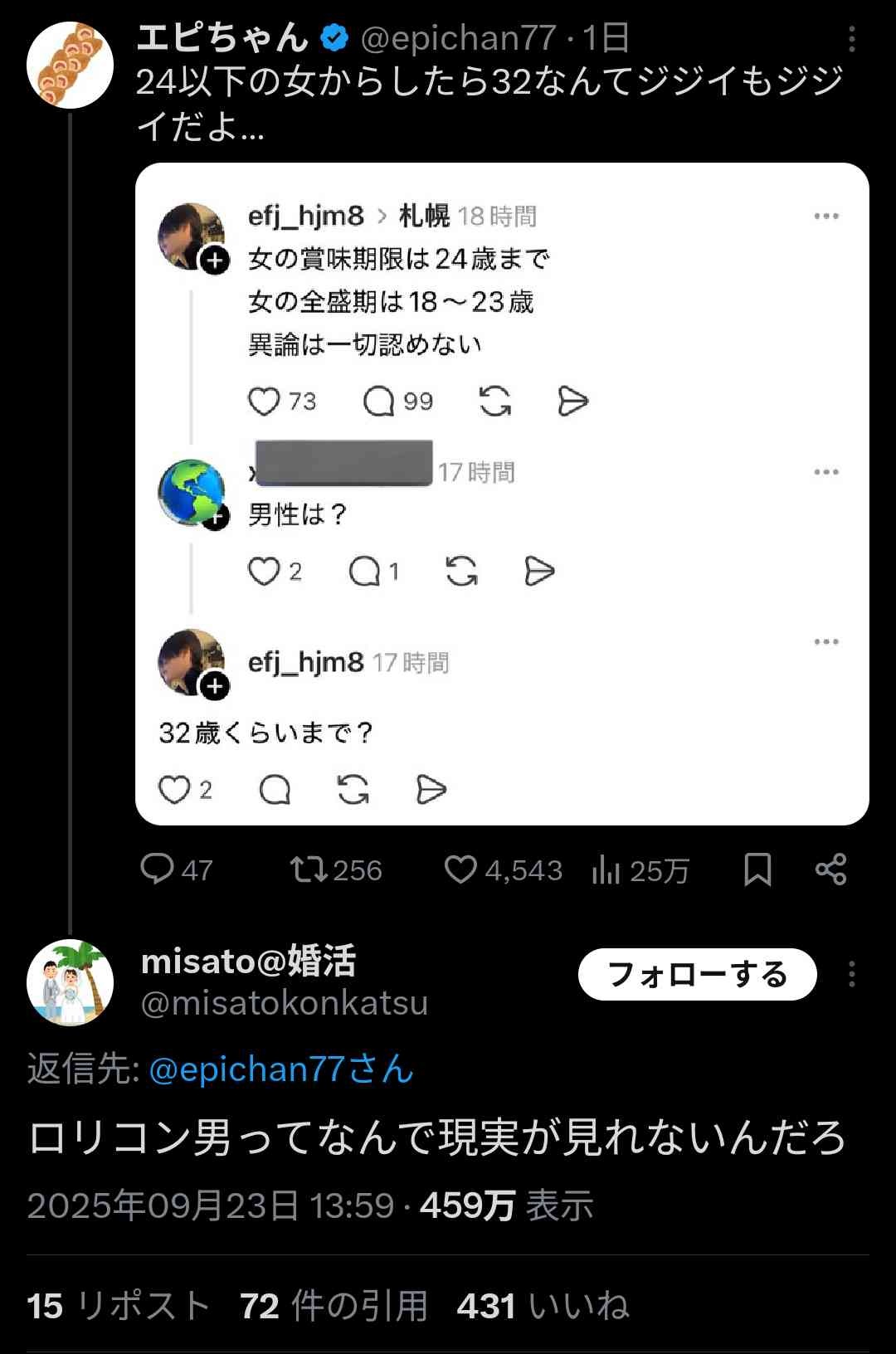 38歳女「ロリコン男ってなんで現実が見れないんだろ。あ、私は見た目24歳だし年下イケメンの養ってくれる男募集中です!」
