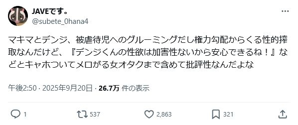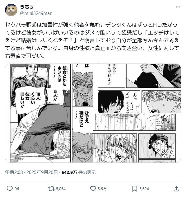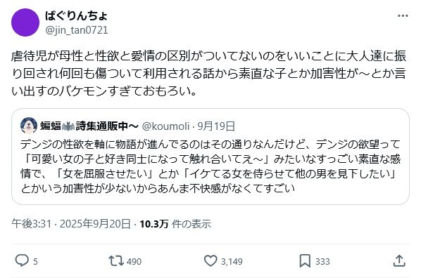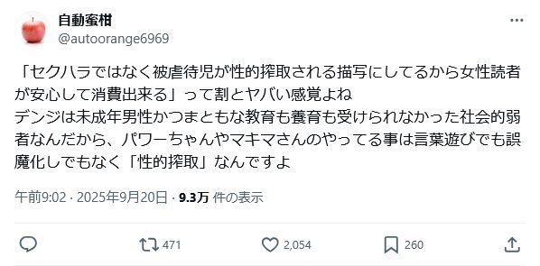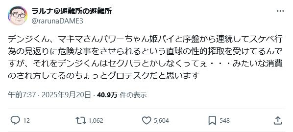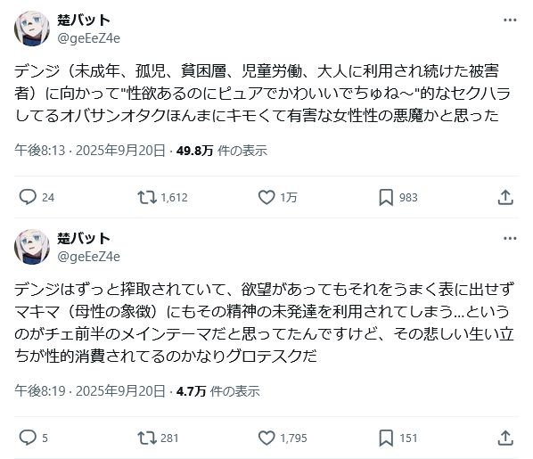 男オタクたち「むしろデンジが加害や性的搾取されてる作品なんですよね」と反論しまくる