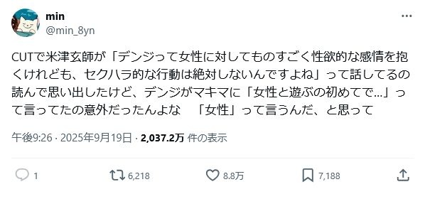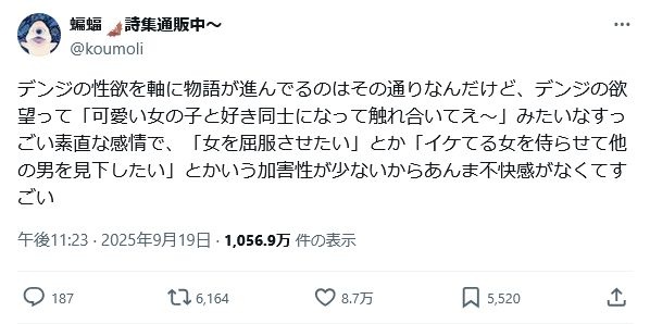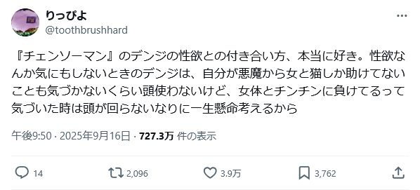 女オタク「デンジの性欲は加害性がなくて安心、かわいい」大バズ